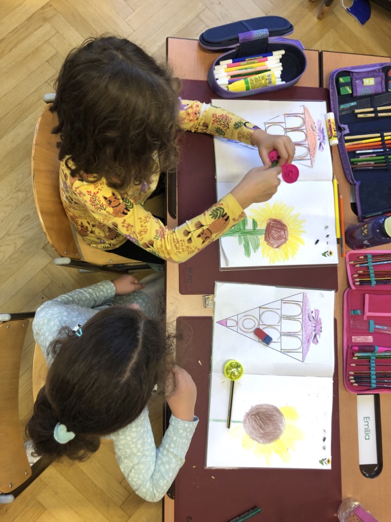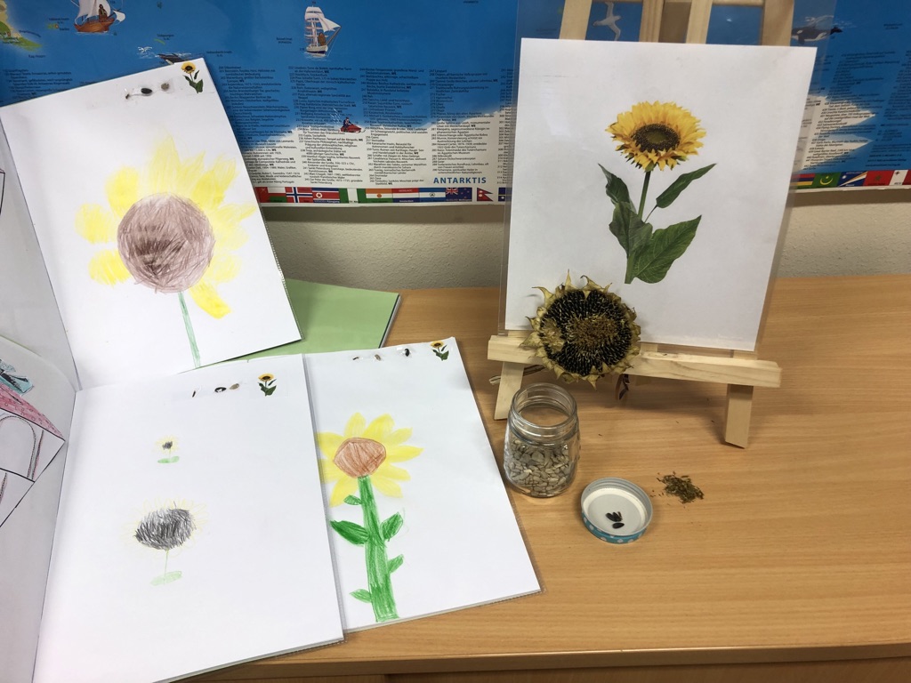 Die 1b beschäftigte sich fächerübergreifend mit dem Thema „die Sonnenblume“ und nahm dafür sowohl den Prozess der Sonnenblume bis hin zum Kern auf unserem Brot in den Blick, als auch die Herstellung eigener Sonnenblumen in Werken, die nun die Klasse schmücken! P.S.: Unsere tollen Sonnenblumen können auch von der Straße aus auf unseren Fenstern bewundert werden!