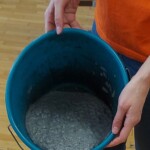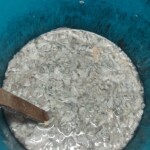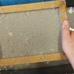 Im Prinzip funktioniert das so: Papier in Streifen zerreißen und danach nochmals in kleinere Stücke teilen. Die Schnipsel in einen Kübel geben, mit heißem Wasser anfüllen und kräftig umrühren. Stehen lassen, rühren, stehen lassen, rühren, … und zum Schluss mit dem Pürierstab pürieren. Alles in ein breites Gefäß geben. Mit einem Sieb wird nun der auf der Wasseroberfläche schwimmende Zellstoff abgeschöpft und auf eine Unterlage gegeben.